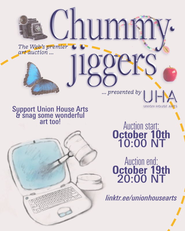 CHUMMYJIGGERS is an online silent auction organized by the fundraising committee at Union House Arts (UHA). The auction serves to create a platform for people to bid on and purchase art from artists across Newfoundland and Labrador, and the rest of Canada. Over forty artists from across the country have graciously donated work in support of UHA to continue programming such as our artist in residence program, exhibitions, workshops, and much more.