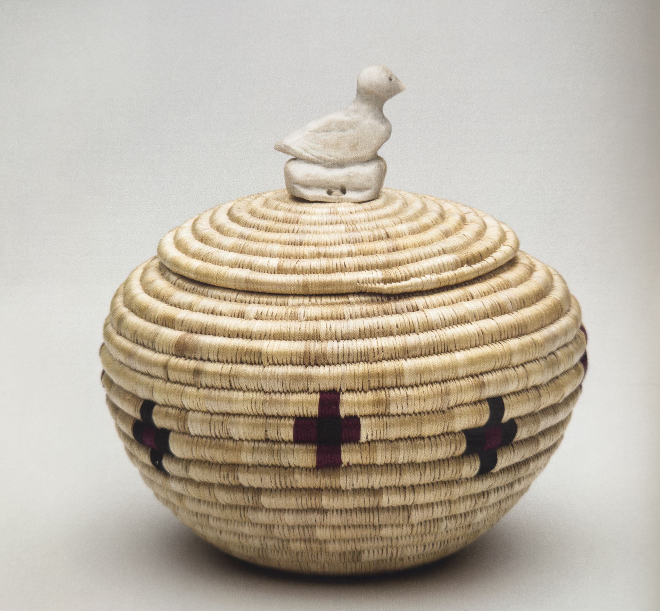 Sarah Baikie, Basket, c. 2003, grass, embroidery thread, caribou antler, 15.2 x 15.2 x 15.2 cm. Collection of Roberta Baikie-Anderson. Photo: The Rooms.